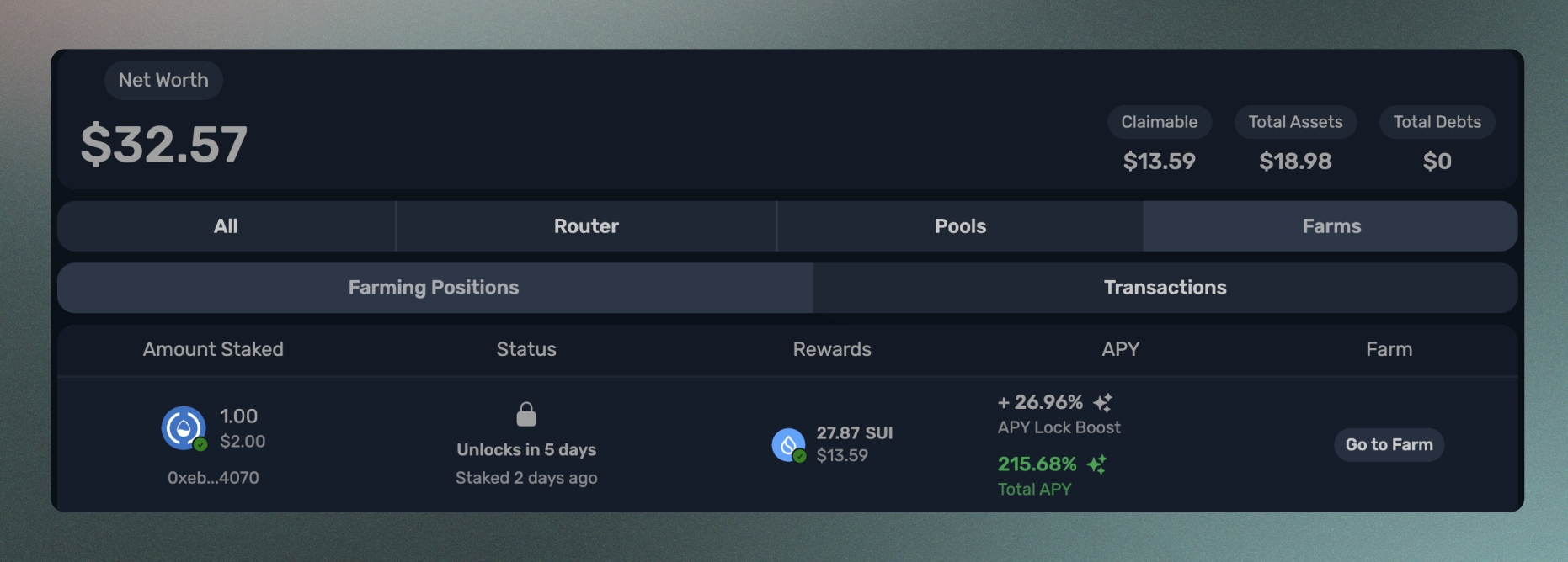 Afterburner Vault에 스테이크 한 후에는 포지션의 상태를 모니터링하고 다양한 작업을 수행할 수 있습니다. 여러 농장에 스테이크한 경우, 포트폴리오 탭으로 이동하여 농장 탭을 선택하고 모든 농장 포지션을 쉽게 볼 수 있으며 각각의 페이지로 이동할 수 있습니다. 포트폴리오 보기: 농장 문서 섹션을 참조하십시오.