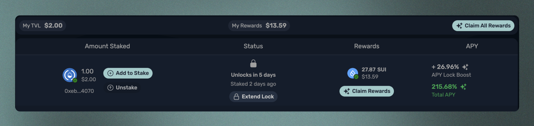 저희 볼트는 Sui에 내재된 소유권 의미론을 활용합니다. 저희 afSUI/SUI LP와 같은 자산을 저희 볼트 중 하나에 스테이크할 때, 스테이크한 코인을 래핑하는 포지션을 생성합니다. 저희 볼트는 포지션에 대해 보상을 배포하는 것을 포함하여 귀하의 StakedPosition과 상호 작용할 수 없습니다 - 그것들은 귀하에 의해서만 소유되기 때문입니다. 따라서 귀하의 포지션의 보상은 귀하가 포지션과 상호 작용하는 트랜잭션에 서명한 후에만 체인상에서 업데이트됩니다. 저희는 보상을 청구하는 행위뿐만 아니라 수행할 수 있는 모든 작업이 귀하의 포지션의 누적 보상을 업데이트하도록 설정했습니다.