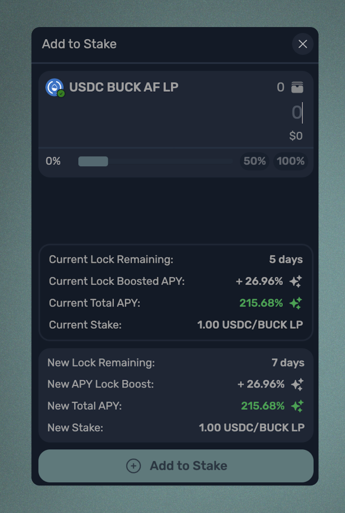 스테이크 추가를 통해 농장에 커밋한 LP 토큰의 양을 늘릴 수 있습니다. 이 옵션을 선택하면 작업을 수행하기 전에 포지션에 대한 변경 사항을 검토할 수 있습니다. 새로운 잠금 기간, 새로운 APY 잠금 부스트 및 총 APY, 스테이크 양과 같은 지표를 검토할 수 있습니다.