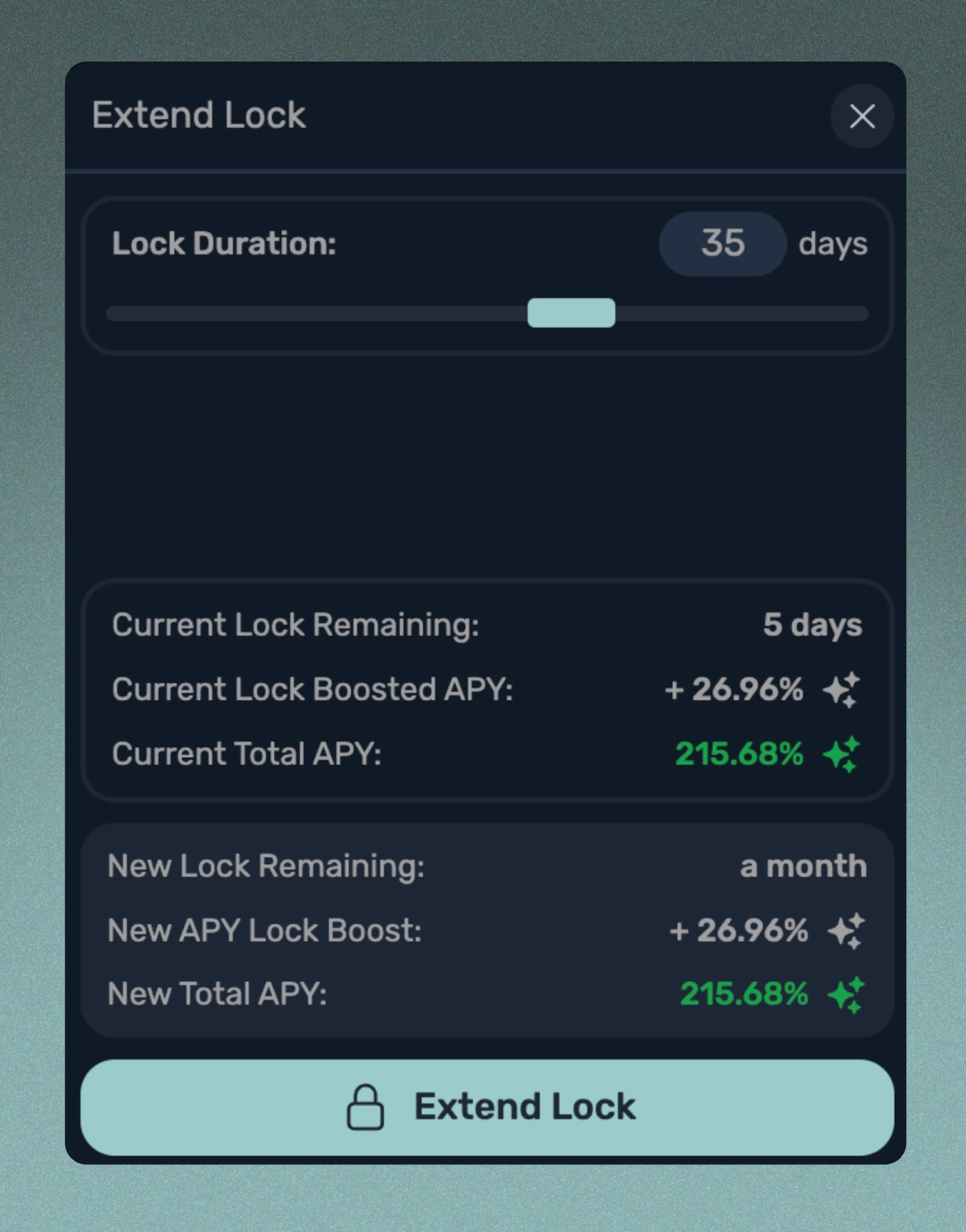잠금 연장을 통해 이전에 스테이크한 LP 토큰을 더 긴 기간 동안 커밋함으로써 추가 보상을 받을 수 있습니다. 이 옵션을 선택하면 거래를 실행하기 전에 새로운 APY와 새로운 잠금 기간을 포함한 스테이킹 포지션에 대한 변경 사항을 검토할 수 있습니다.