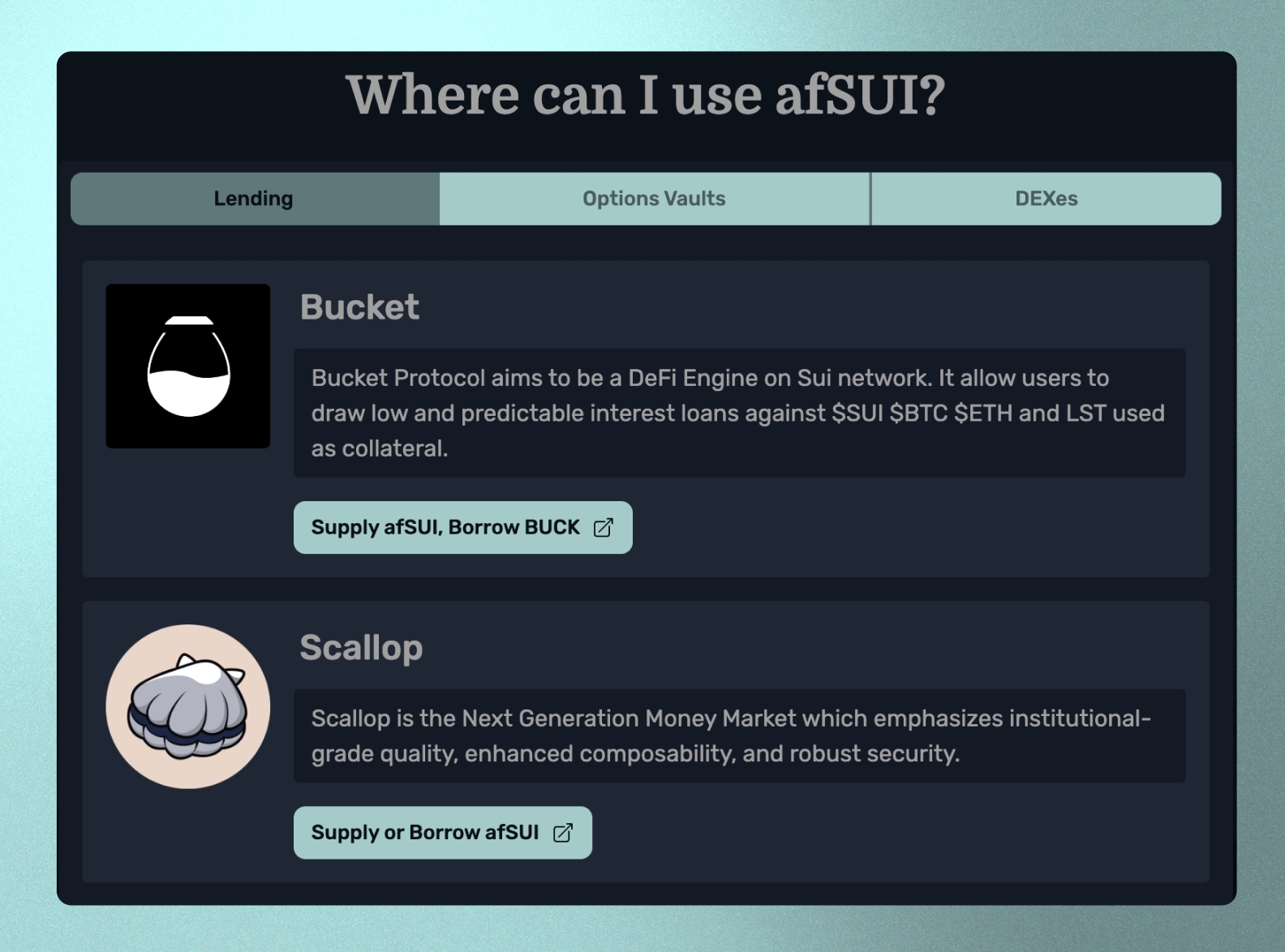Aftermath는 afSUI를 SUI 토큰 자체만큼이나 대체 가능하고 조합 가능하게 설계했으며, 동시에 스테이킹 보상을 적립합니다.