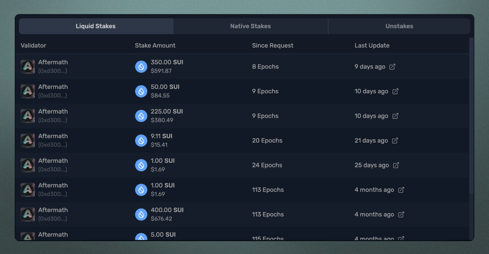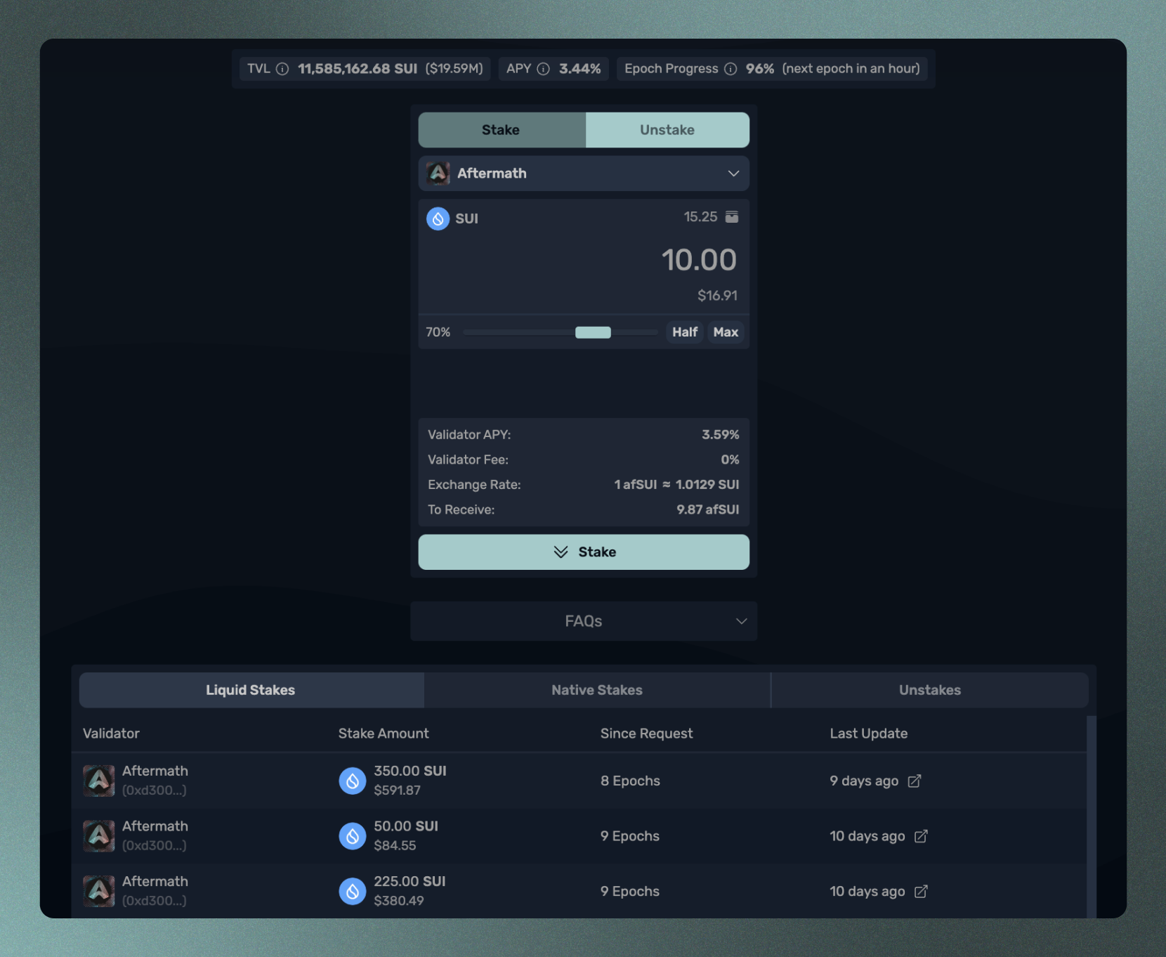 검증자를 선택한 후, afSUI로 스테이크하고자 하는 SUI 토큰의 양을 입력하고 스테이크를 클릭하세요. afSUI는 즉시 여러분의 지갑에 발행됩니다. 여러분이 새로 개설한 유동 스테이킹 포지션과 이전에 개설한 모든 포지션은 스테이크 메뉴 아래의 Liquid Stakes 탭에 표시됩니다.
