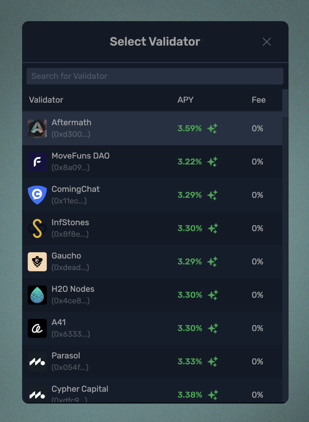검증자 선택 드롭다운에서는 스테이킹 APY와 스테이크 수수료를 포함한 지표를 볼 수 있습니다. 스테이킹 APY는 해당 검증자의 과거 성능을 바탕으로 계산된 추정 연간 퍼센트 수익률입니다. 모든 afSUI는 동일한 APY를 얻지만, 사용자가 더 성능이 좋은 검증자를 개별적으로 선택하면 afSUI 전체의 APY가 증가합니다. 스테이크 수수료는 검증자가 선택할 수 있는 선택적 수수료이며, 기본값은 0입니다. 검증자 스테이크 수수료가 부과되는 경우, 그 수수료는 스테이킹 시 스테이크된 SUI 토큰의 원금에서 차감됩니다. 예를 들어, 검증자가 1%의 수수료를 설정하고 사용자가 1 SUI를 스테이킹하는 경우, 검증자는 스테이킹 시 0.01 SUI를 받고 0.99 SUI가 스테이크됩니다.