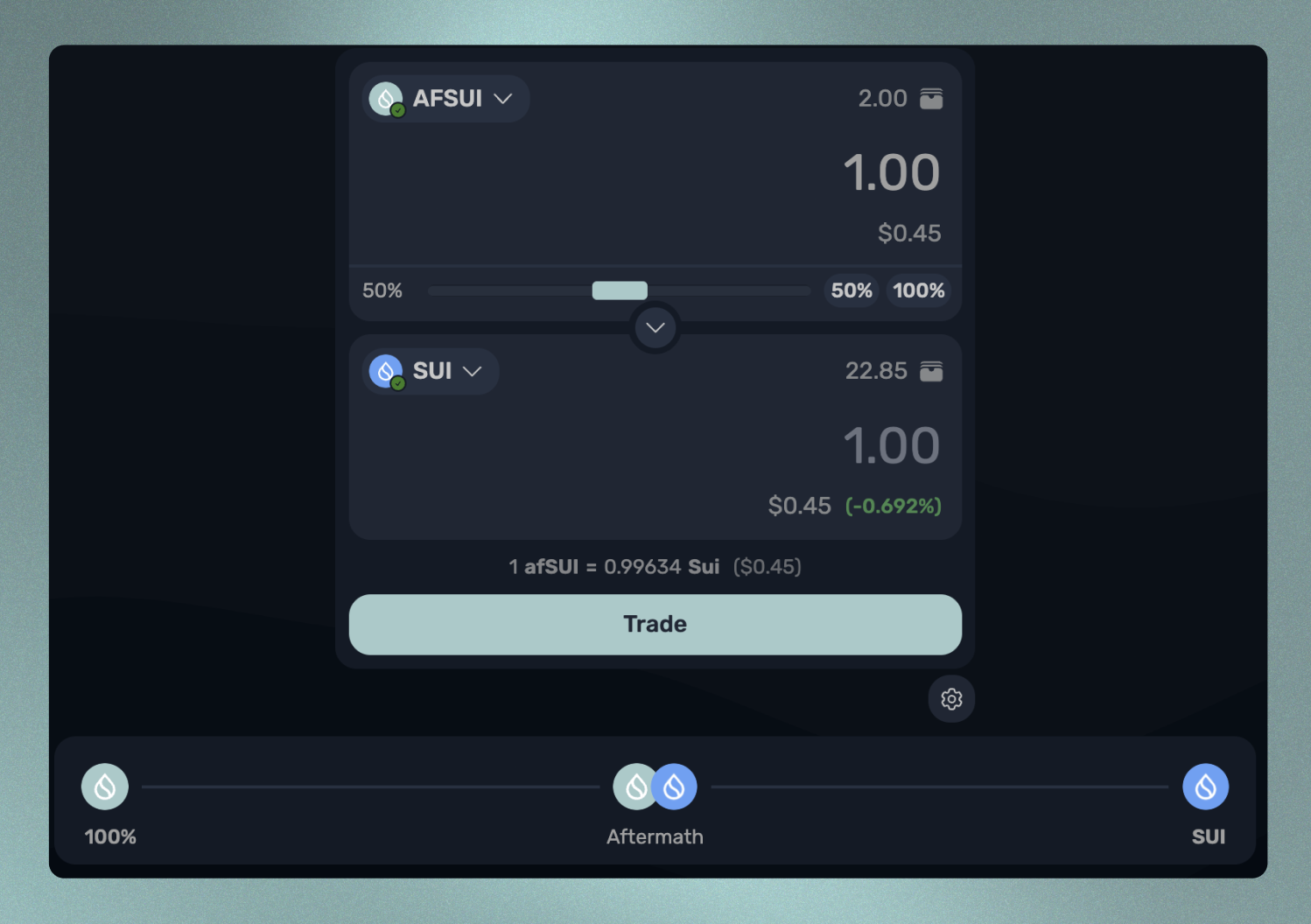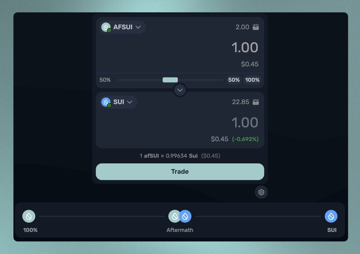afSUI를 SUI로 교환하는 세 번째 방법은 스마트-오더 라우터를 사용하여 스왑을 수행하는 것입니다. Aftermath와 여러 탈중앙화 거래소는 이러한 거래를 가능하게 하는 afSUI-SUI 유동성 풀을 유지합니다. 풀의 재고와 Aftermath 즉시 스테이크 해제 예비량에 따라, 이 방법을 사용하는 것이 더 바람직할 수 있습니다. 거래 페이지로 이동하여 교환될 자산으로 afSUI를 선택하고 받을 자산으로 SUI를 선택하여 현재 환율을 확인하세요.