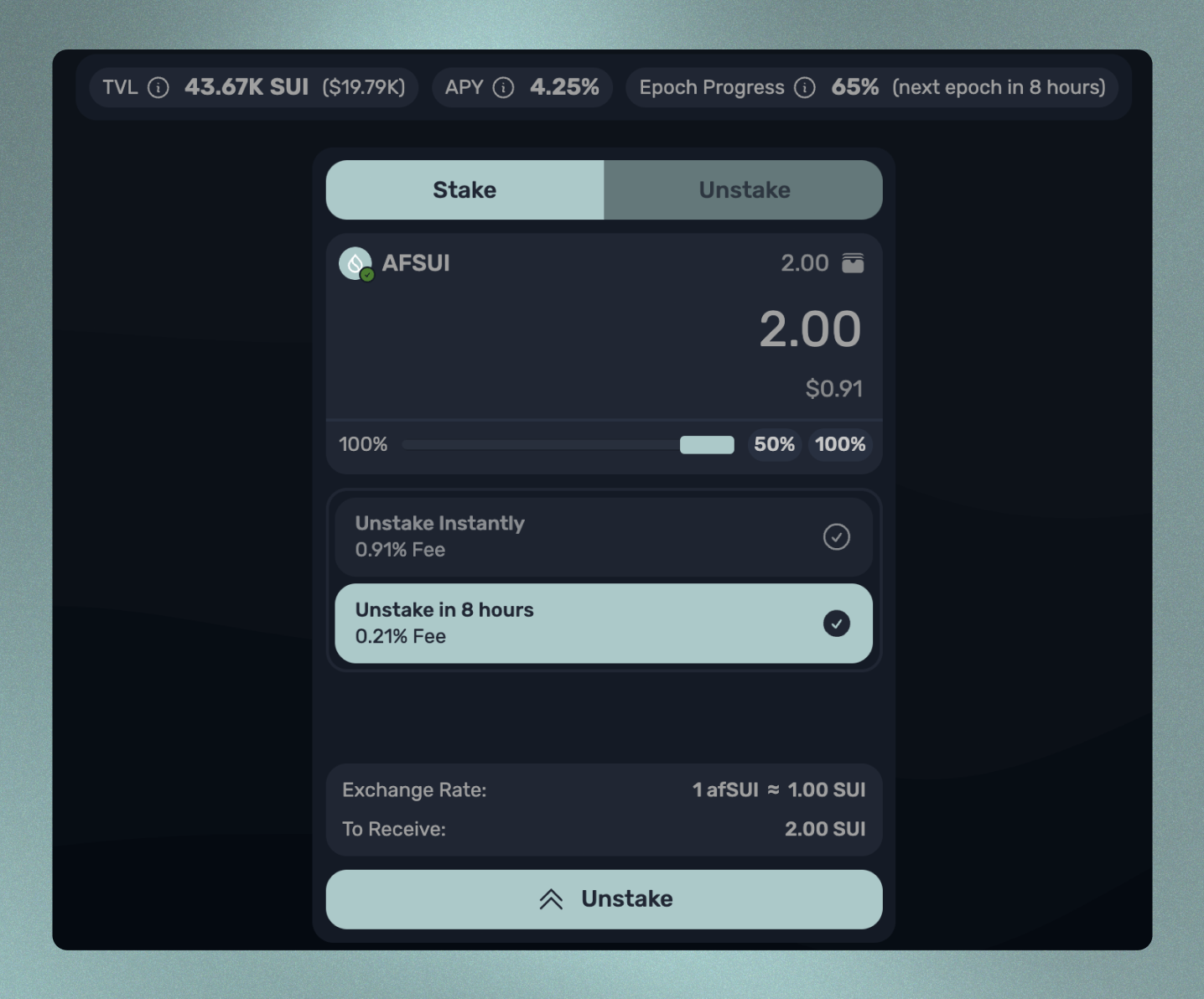 각 스테이크 해제 유형의 수수료가 표시되어 사용자가 에폭이 진행될 때까지 기다릴지 아니면 즉시 SUI 토큰을 받고 싶은지 결정할 수 있습니다. 어떤 스테이크 해제 방법을 사용할지 결정한 후, 교환하고자 하는 afSUI의 양을 입력하고 스테이크 해제를 클릭하세요.
