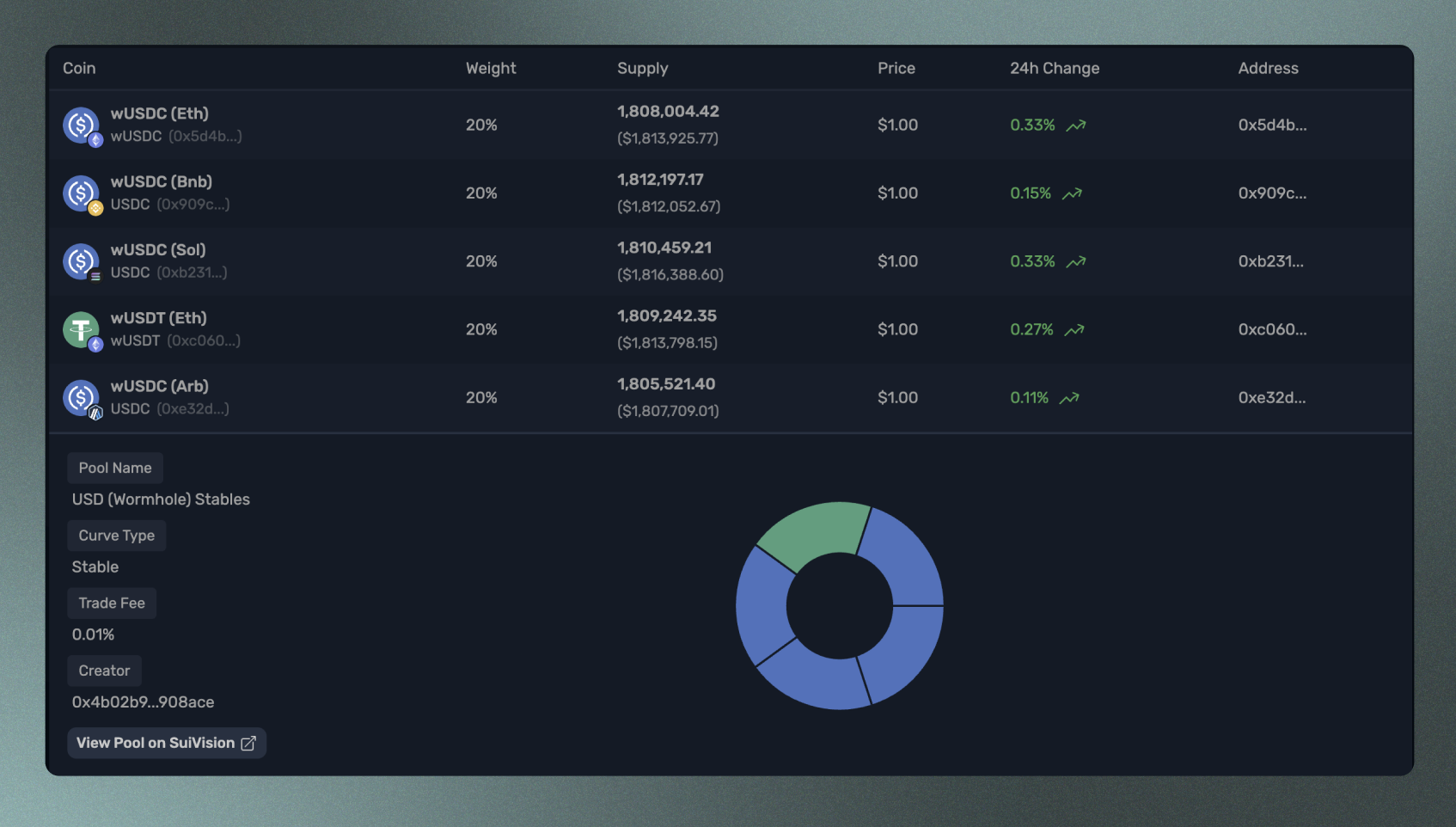 우리의 CFMM은 또한 ETH, BTC, SUI, USDC 또는 사용자가 원하는 어떤 상대적 무게의 조합이든지 가능한 비상관 자산 풀을 지원합니다. 풀 내의 여러 코인 간의 효율적인 스왑을 촉진하는 것 외에도, 이러한 비상관 풀은 다양한 유형의 바스켓 생성을 허용합니다. 예를 들어, 각 개별 코인이 전체 풀의 100%까지 모두 합쳐야 하지만, 블루칩 지수나 밈 코인 지수를 만들 수 있습니다.