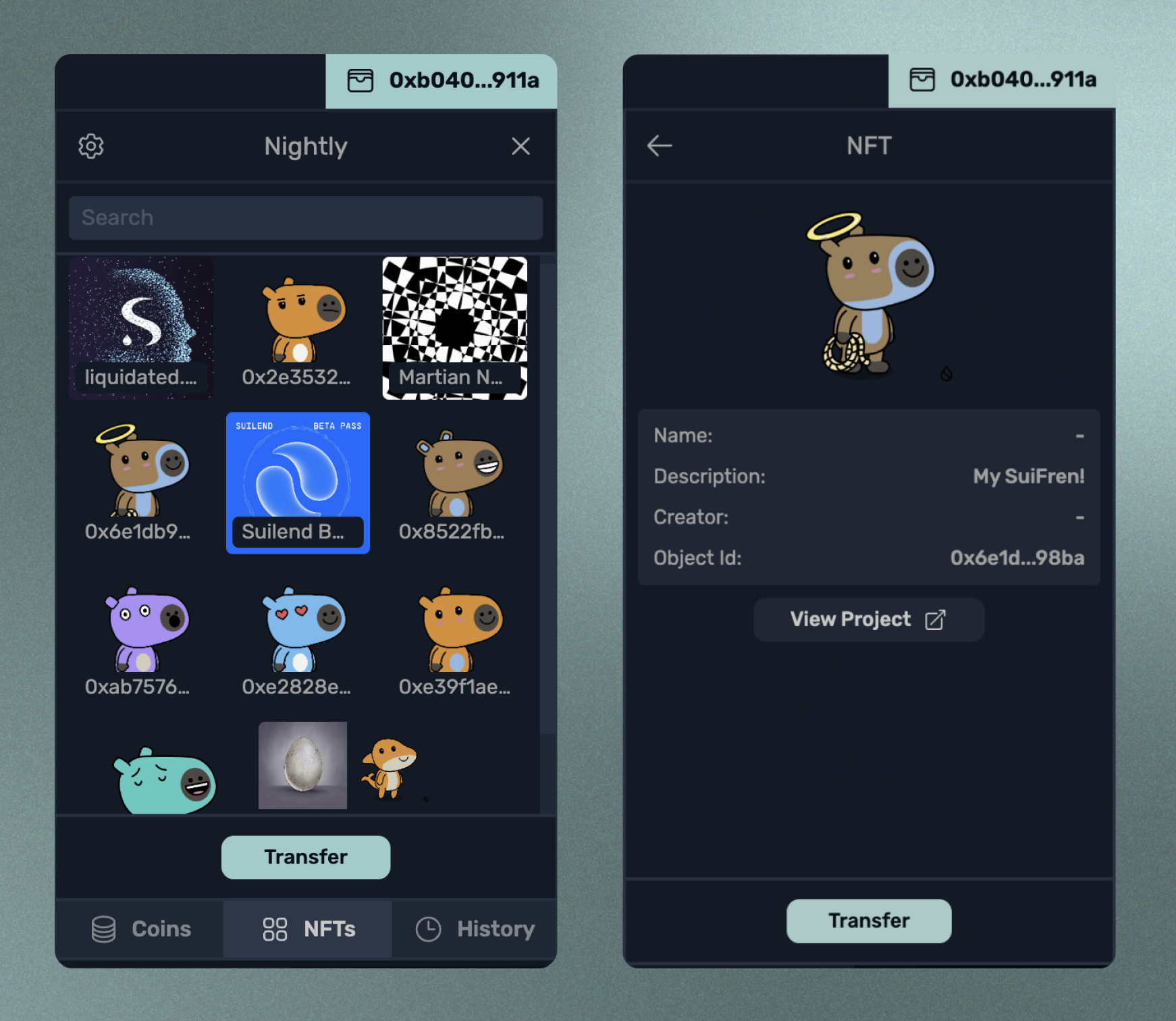 NFT 탭을 클릭하여 Aftermath 지갑 드롭다운을 통해 NFT를 볼 수 있습니다. NFT를 선택하면 이름, 설명, 작성자 및 개체 ID를 확인할 수 있습니다. 개체 ID를 클릭하면 지정된 탐색기에서 NFT가 열리고 프로젝트 보기 버튼을 통해 프로젝트 웹사이트 링크에 액세스할 수 있습니다.