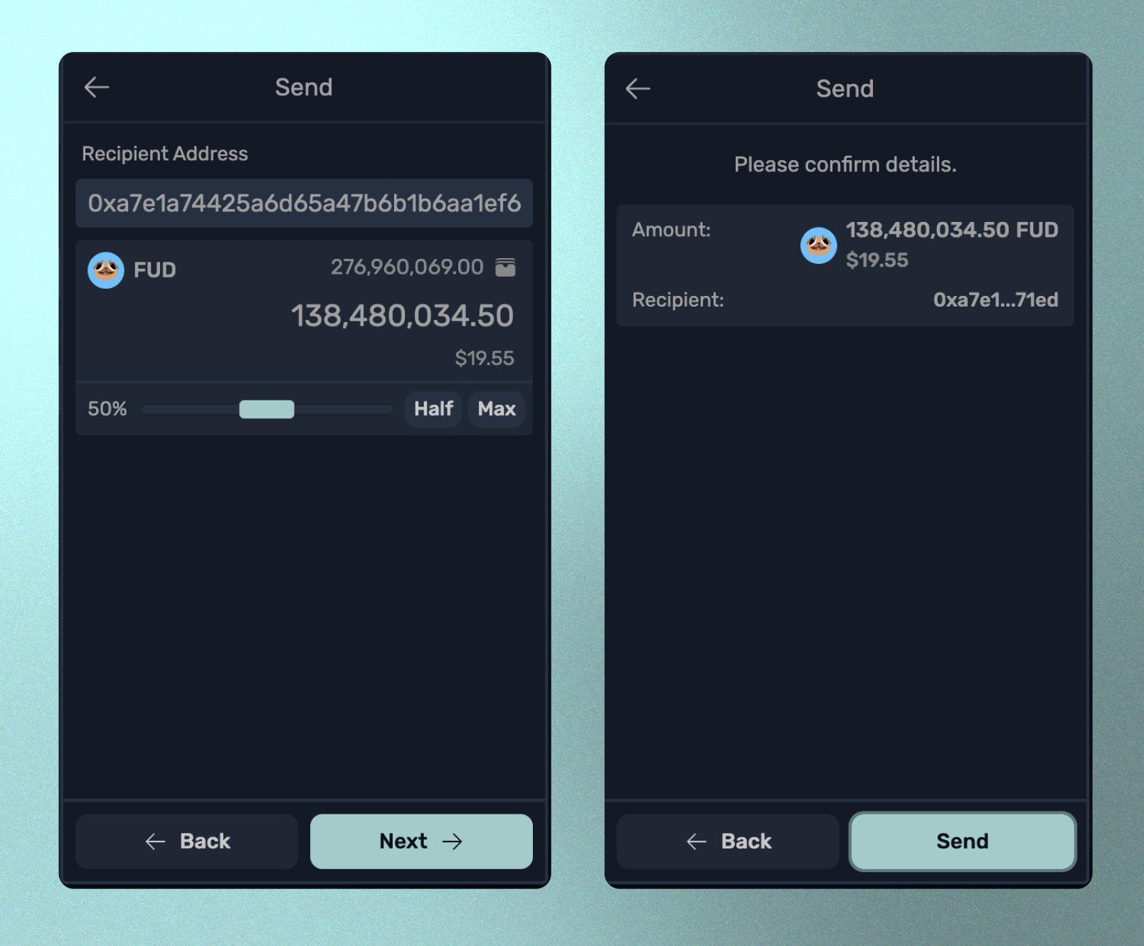 보내려는 코인을 선택하면 목적지 주소와 보낼 코인 금액을 입력하라는 메시지가 표시됩니다. 세부 사항을 입력하고 다음을 클릭하면 확인이 나타납니다. 모든 것이 올바른지 검토하고 보내기를 누르면 전송이 완료됩니다.