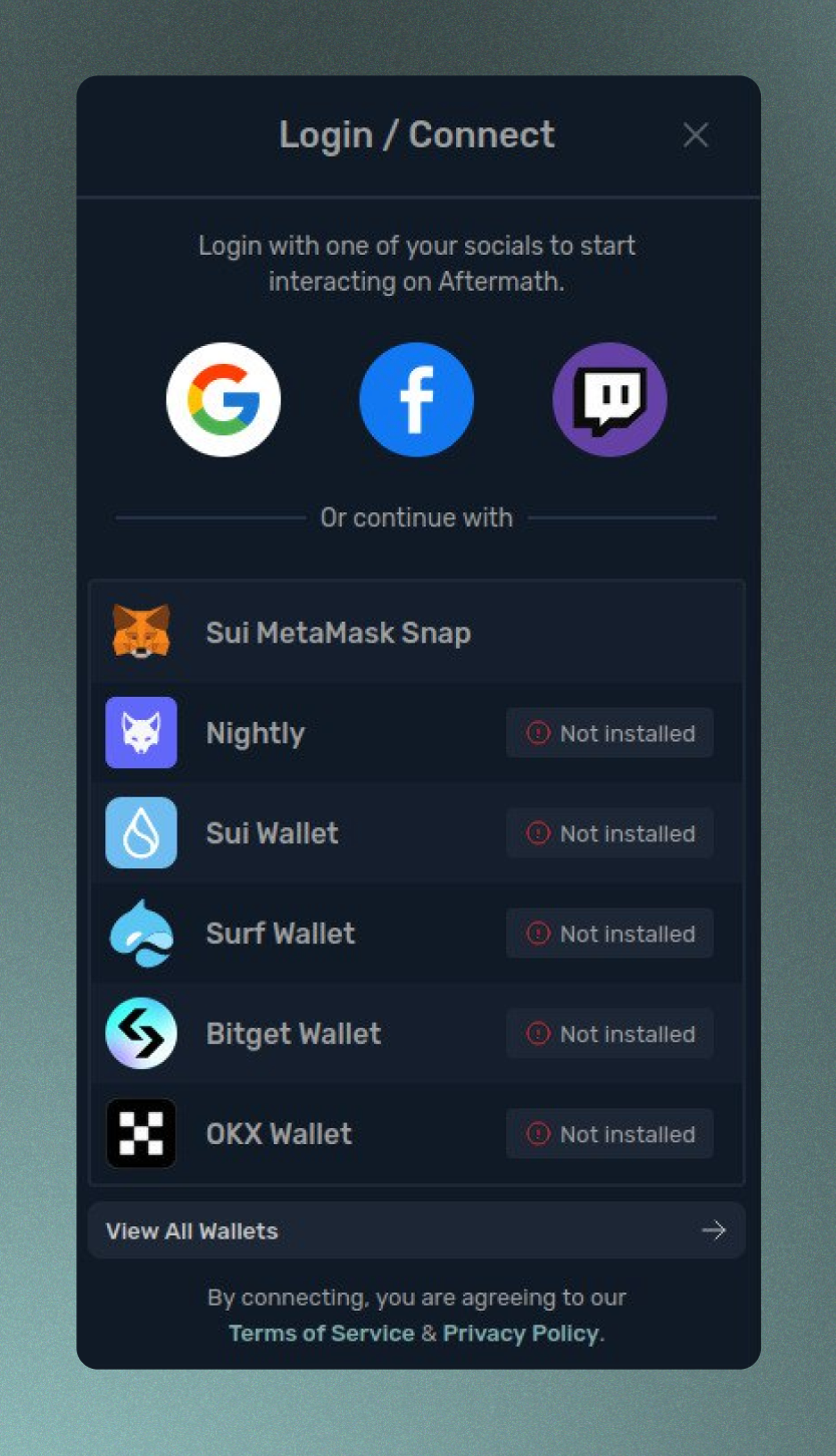 앱의 맨 오른쪽 상단에서 "지갑 연결"이라고 적힌 버튼을 볼 수 있습니다. 여기를 클릭하면 선호하는 지갑을 연결할 수 있으며, 설치되어 있는 경우 선택할 수 있습니다. 아직 Sui 지갑이 설치되어 있지 않다면, 선택한 지갑을 클릭하여 각각의 설치 페이지로 이동하면 됩니다.