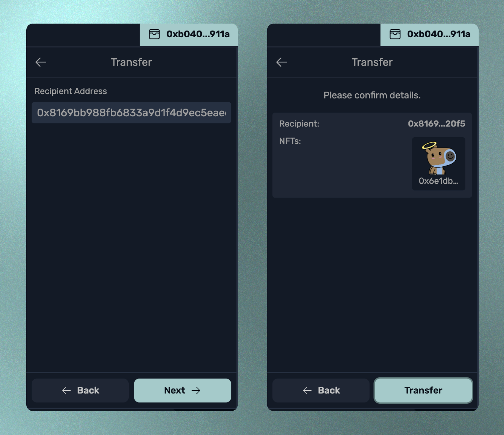 NFT 탭 하단에 있는 전송 버튼을 클릭하여 NFT를 전송할 수도 있습니다. NFT를 전송하고자 하는 Sui 지갑 주소를 복사하고 Next를 클릭하여 거래를 검토하기만 하면 됩니다. 전송하고자 하는 NFT와 목적지 주소가 정확한지 확인했다면 전송을 클릭하여 거래를 완료합니다.