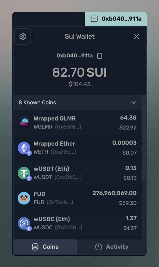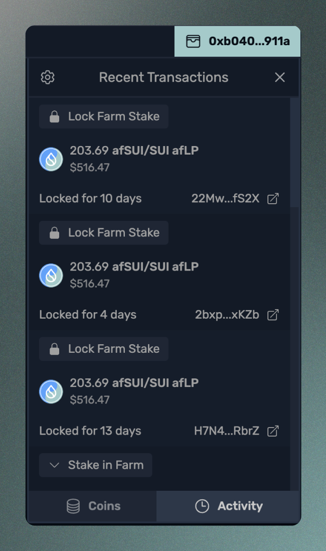 지갑 메뉴를 통해 Aftermath에서 코인과 모든 활동을 볼 수 있습니다. 연결된 후, 지갑 드롭다운을 열면 잔액이 표시되고, 하단의 "활동" 버튼을 클릭하면 최근 거래를 볼 수 있습니다. 이 정보는 포트폴리오 페이지에서도 확인할 수 있습니다.