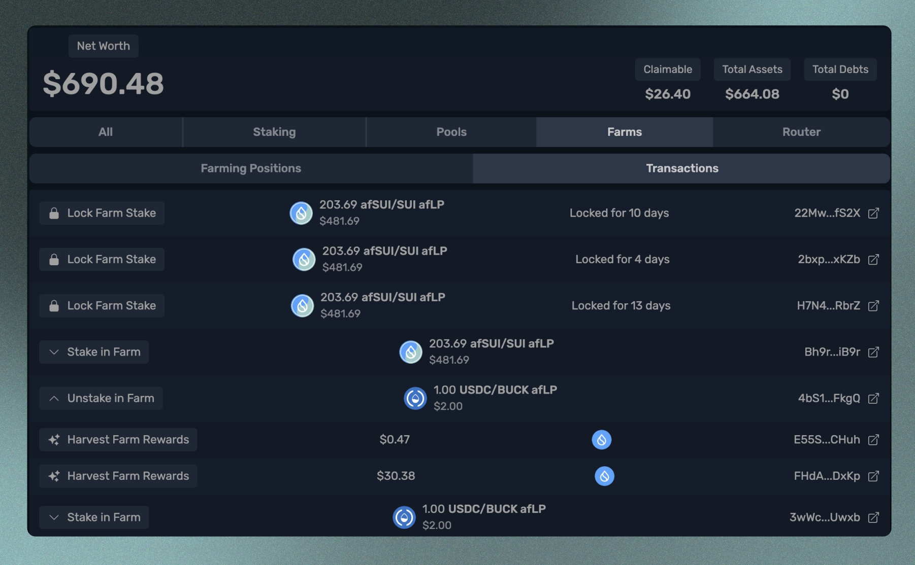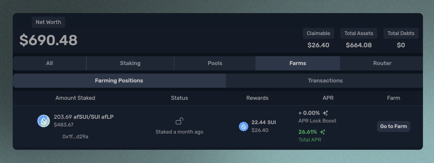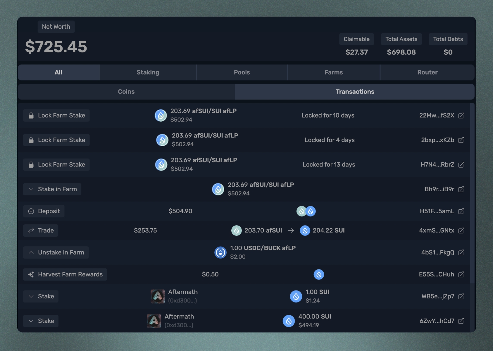 포트폴리오 탭으로 이동하면, Aftermath의 모든 제품에 배포된 지갑 내 모든 코인을 한 곳에서 볼 수 있습니다. 스왑 수행, 스테이킹, 풀이나 농장에 입금하거나 출금하는 등의 모든 활동도 확인할 수 있습니다.