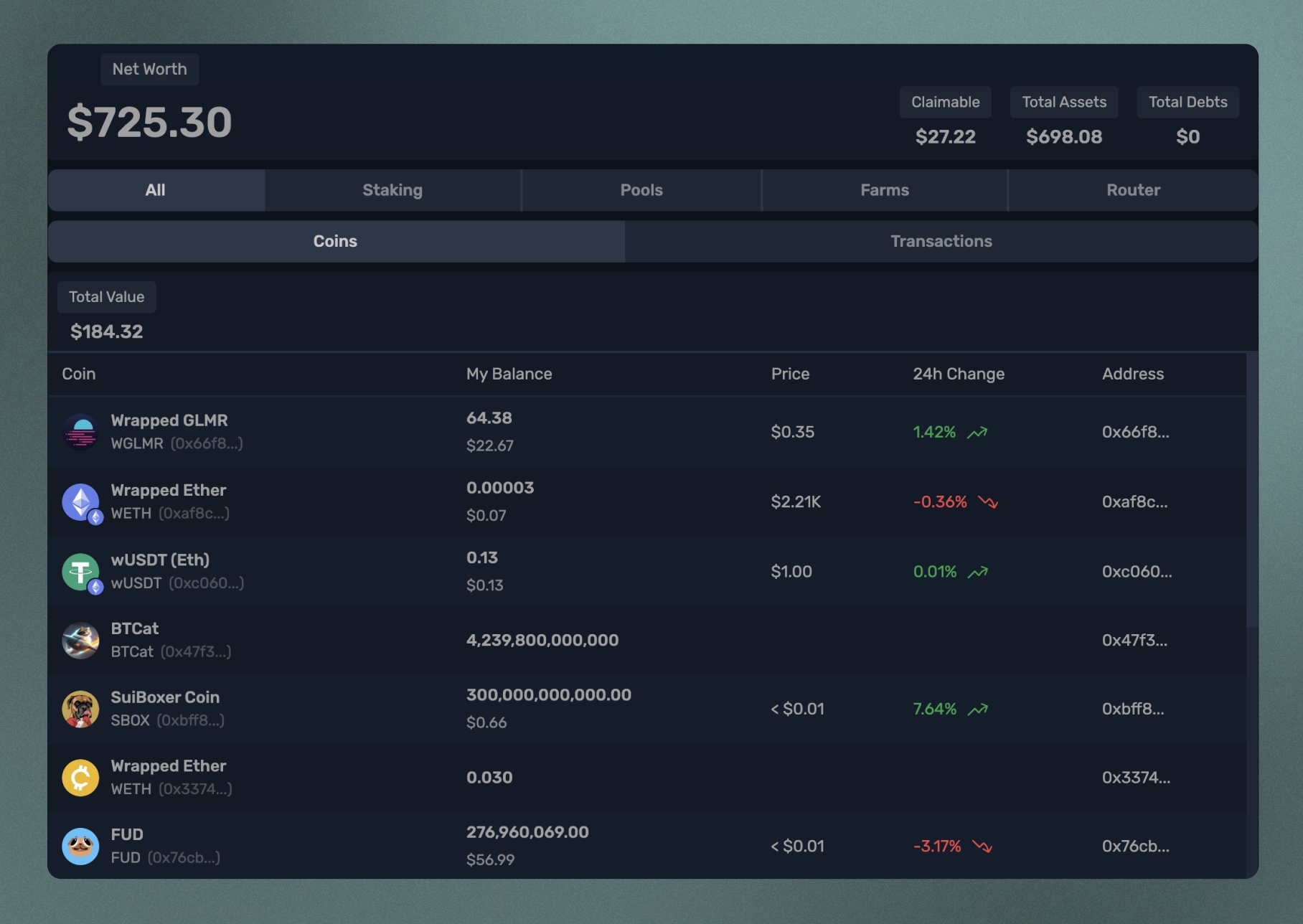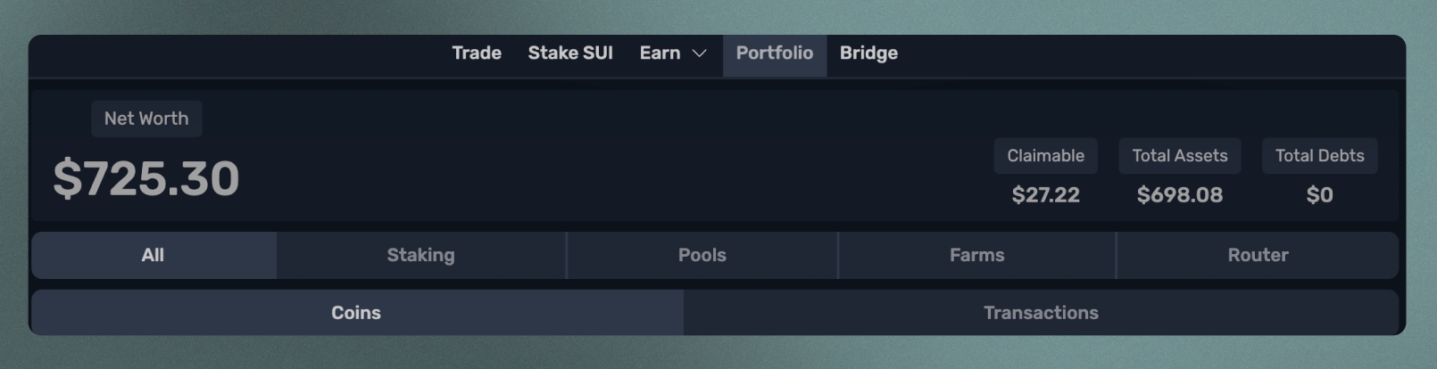 포트폴리오 페이지 상단에서는 모든 자산의 분석을 볼 수 있습니다. 왼쪽에서 오른쪽으로, 첫 번째는 "순자산"입니다. 이는 지갑 내의 모든 코인, 유동성 풀과 농장에 예치된 것, 스테이킹된 SUI와 afSUI, 그리고 청구되지 않은 보상의 총 가치입니다. 다음으로 "청구 가능한" 잔액을 볼 수 있는데, 이는 농장에서 얻은 보상 중 아직 청구하지 않은 금액입니다. "총 자산"은 순자산에서 청구 가능한 잔액을 뺀 값입니다. "총 부채"는 빌린 코인의 가치를 나타냅니다.