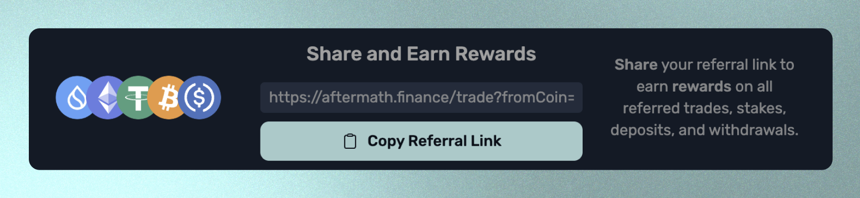 추천을 통해 사용자는 dApp에서 거래, 스테이킹 또는 유동성 제공을 통해 다른 사람들을 Aftermath 커뮤니티에 초대할 수 있습니다. 추천은 추천인과 추천인의 두 당사자로 구성됩니다. 추천인은 현재 Aftermath 사용자이며, 추천 링크를 생성하여 친구들과 공유합니다. 심판은 Aftermath에 대한 추천 링크를 따라 dApp을 사용하기 시작하는 당사자입니다.