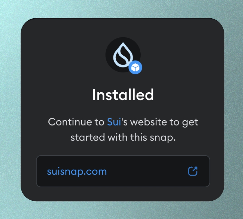 Sui Snap이 설치되었음을 나타내는 확인이 표시됩니다. Metamask를 Suisnap.com에 연결하려면 링크를 따르세요.