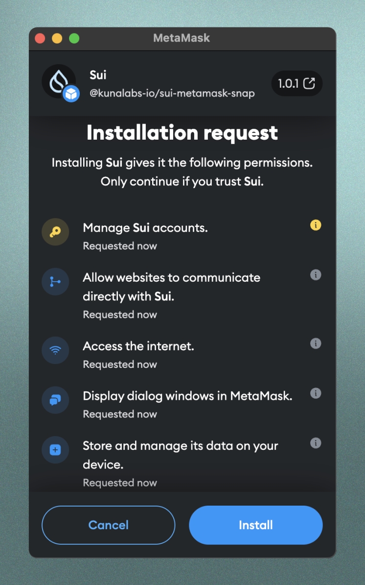 Metamask에 추가하기 버튼을 클릭하면 Third-party software 알림이 표시됩니다. 수락을 클릭하고 Metamask 브라우저 지갑 메뉴가 표시되어 Sui Snap에 연결하도록 안내됩니다.