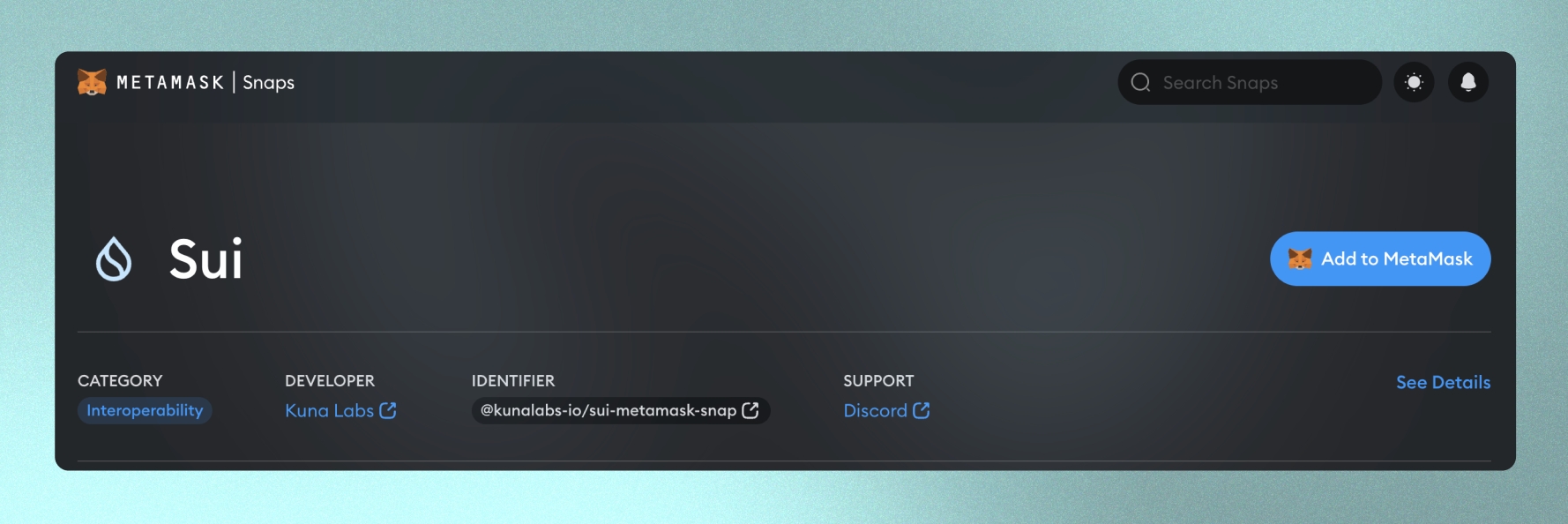 Metamask 지갑에 Sui Snap을 설치하려면 먼저 Snaps 디렉터리의 Sui Snap 페이지로 이동하십시오: Sui Metamask Snap